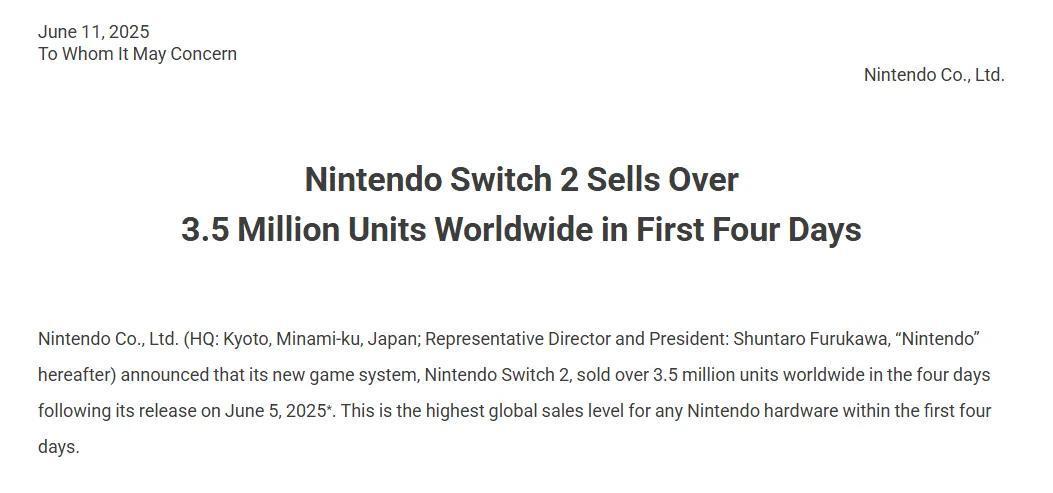 6月,Switch 2正式发布后的短短四天内全球销量就超过了350万台,刷新了任天堂历史上游戏主机的销售速度记录。