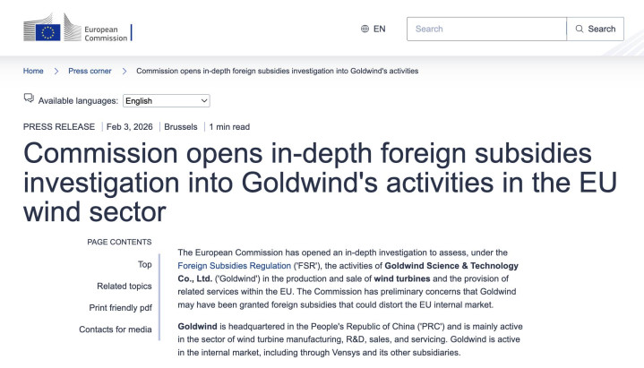 此次调查可追溯至2024年4月,当时欧盟委员会对包括金风科技在内的多家在欧风电企业发起初步调查。经过近两年的初步调查,欧委会称发现金风科技可能获得政府赠款、税收优惠和优惠贷款等“扭曲性补贴”。
