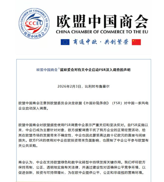 欧盟中国商会发表声明,对欧盟频繁使用FSR调查中企表示严重关切和坚决反对。声明指出,这些调查已给中企造成高达数十亿欧元的直接与间接损失。